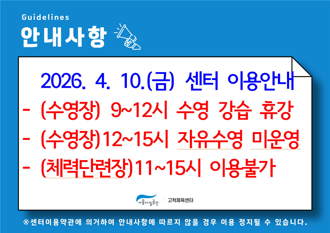 * 체육센터 직원에게 무분별한 폭언과 폭행, 성희롱, 부당한 비난이나 무리한 요구등을 하실 경우 약관에 따라 회원자격 정지 및 관련법에 따라 처벌받을 수 있습니다.